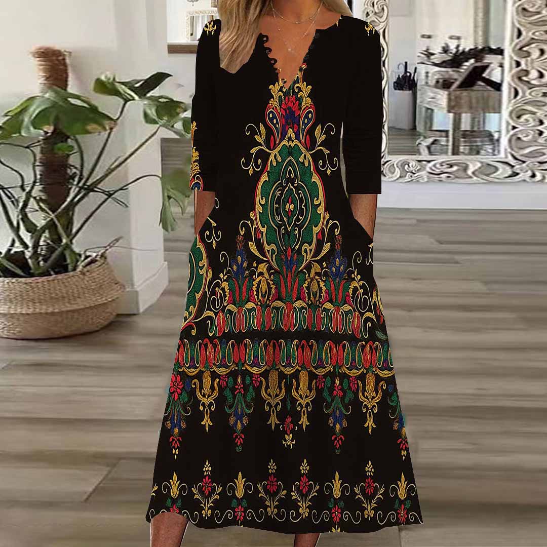 Women Graphic,Black DZHB8175 Long Sleeve V-Neck Graphic Printed Midi Dress