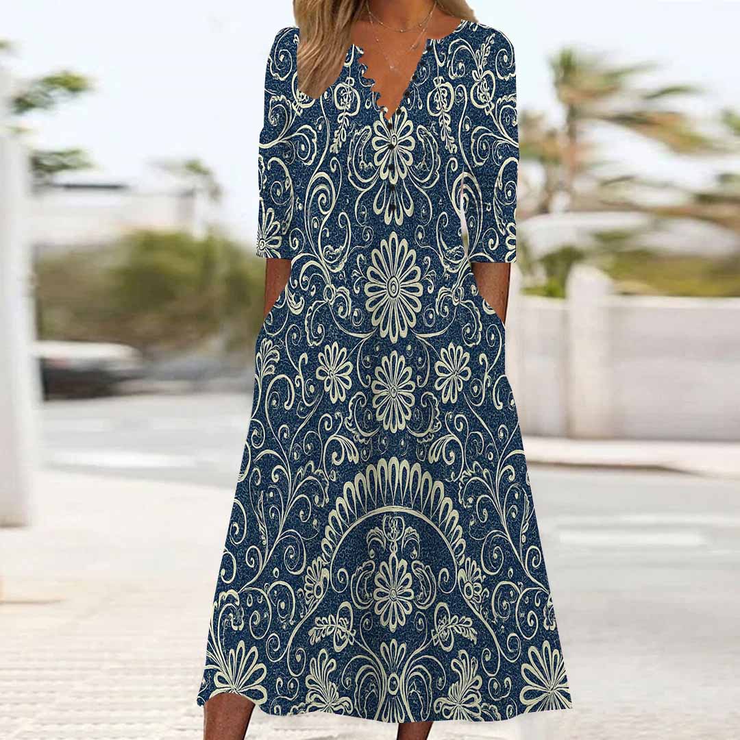 Women Graphic,Blue DZHB8178 Long Sleeve V-Neck Graphic Printed Midi Dress