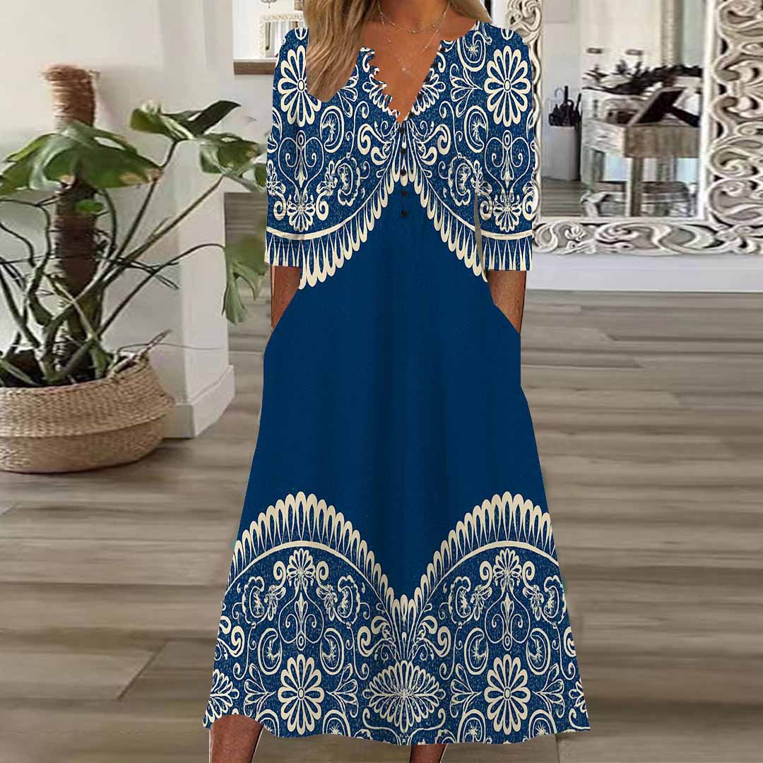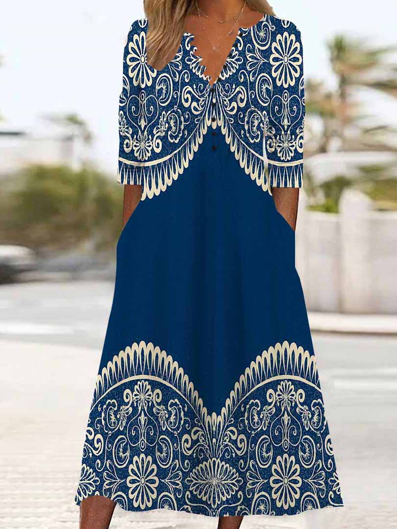 Women Graphic,Blue DZHB8292 Long Sleeve V-Neck Graphic Printed Midi Dress