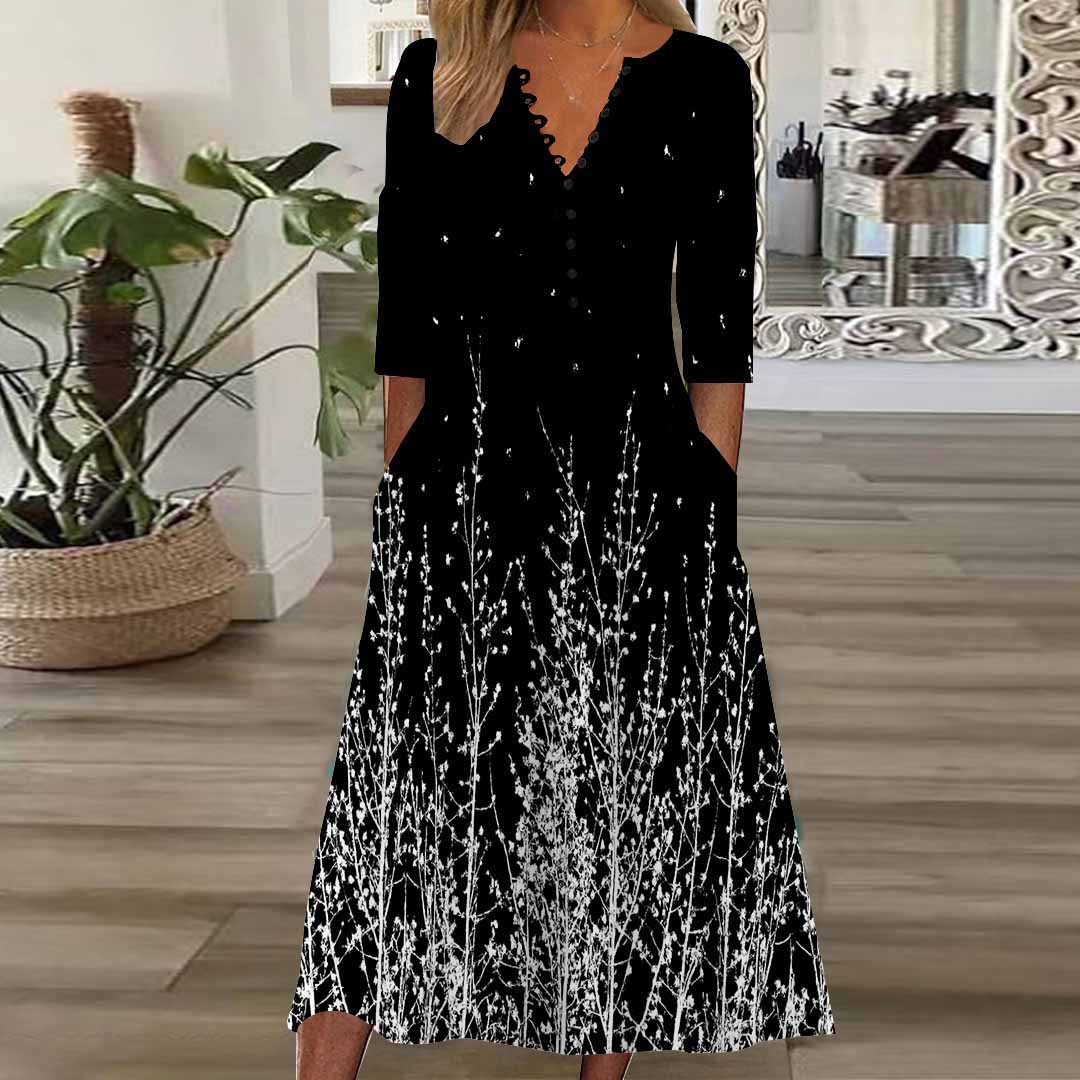 Women Floral,Black DZHB8350 Long Sleeve V-Neck Graphic Printed Midi Dress