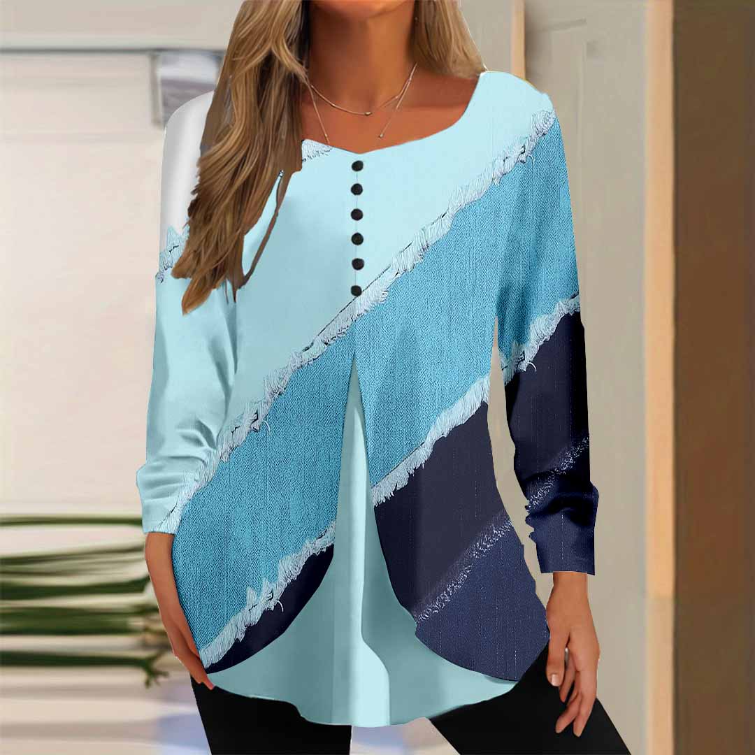 Women Striped,Colorblock,Blue DZGG8021 Long Sleeve Scoop Neck Printed Graphic Button Fake 2in1 Tops