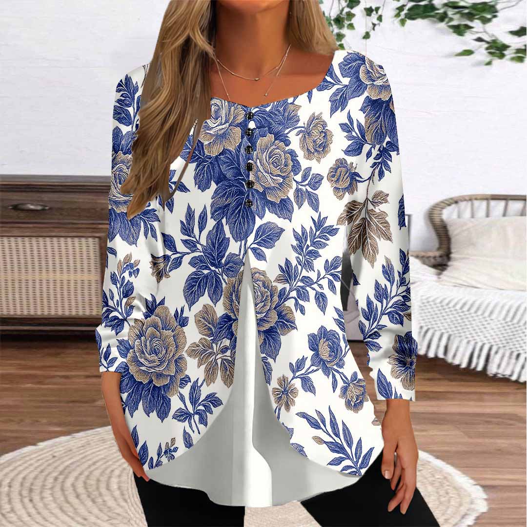 Women Floral,Blue DZGG8158 Long Sleeve Scoop Neck Printed Graphic Button Fake 2in1 Tops