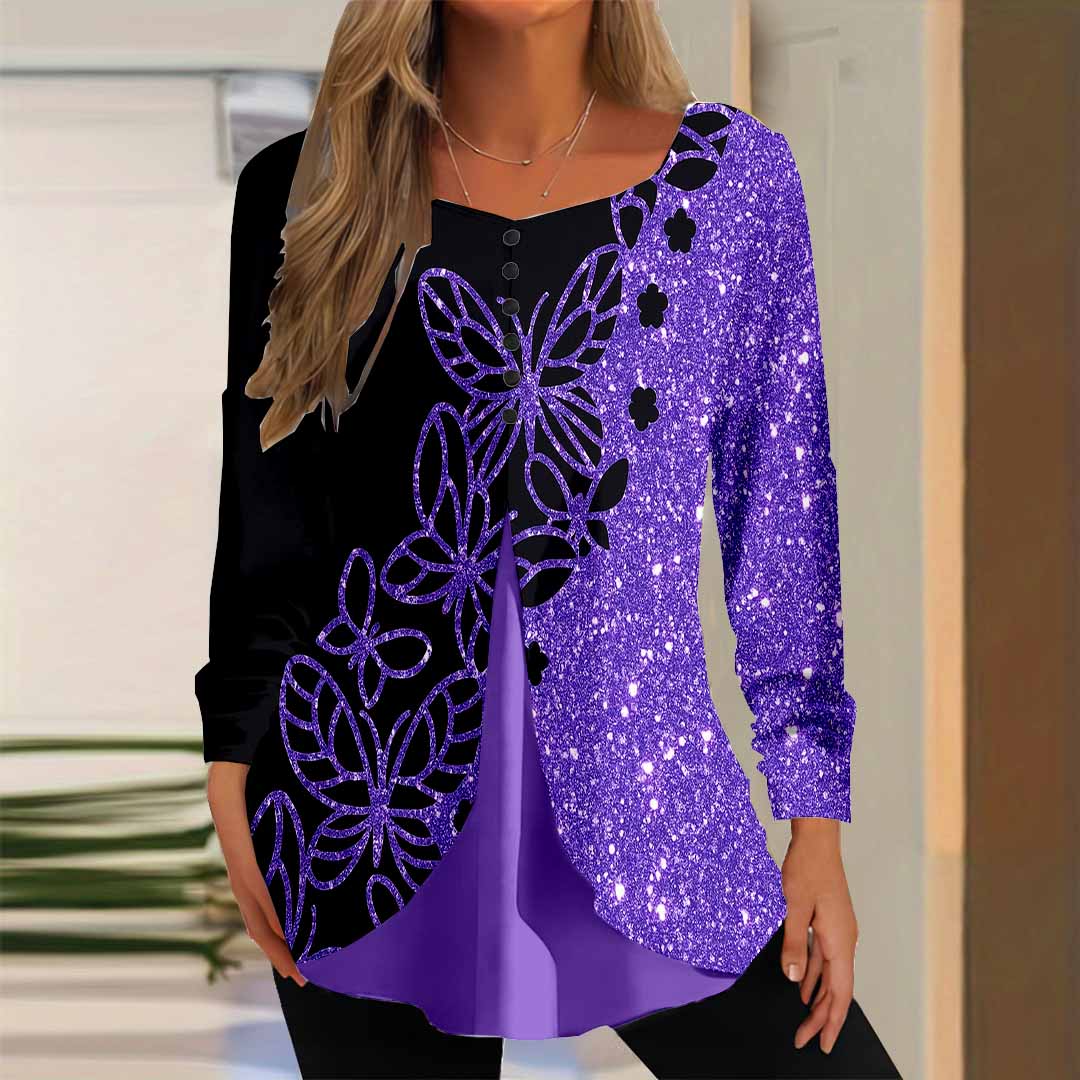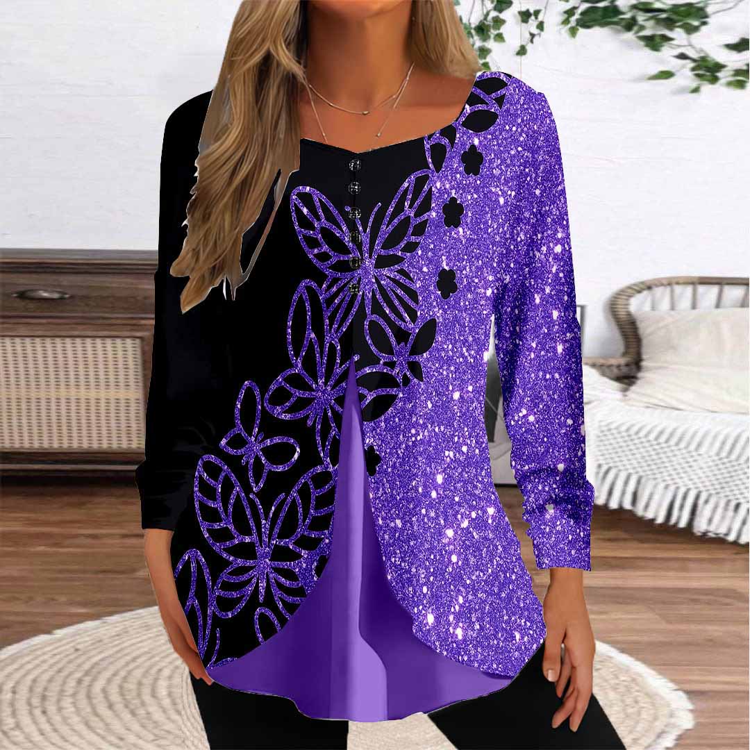 Women Graphic,Purple DZGG8162 Long Sleeve Scoop Neck Printed Graphic Button Fake 2in1 Tops