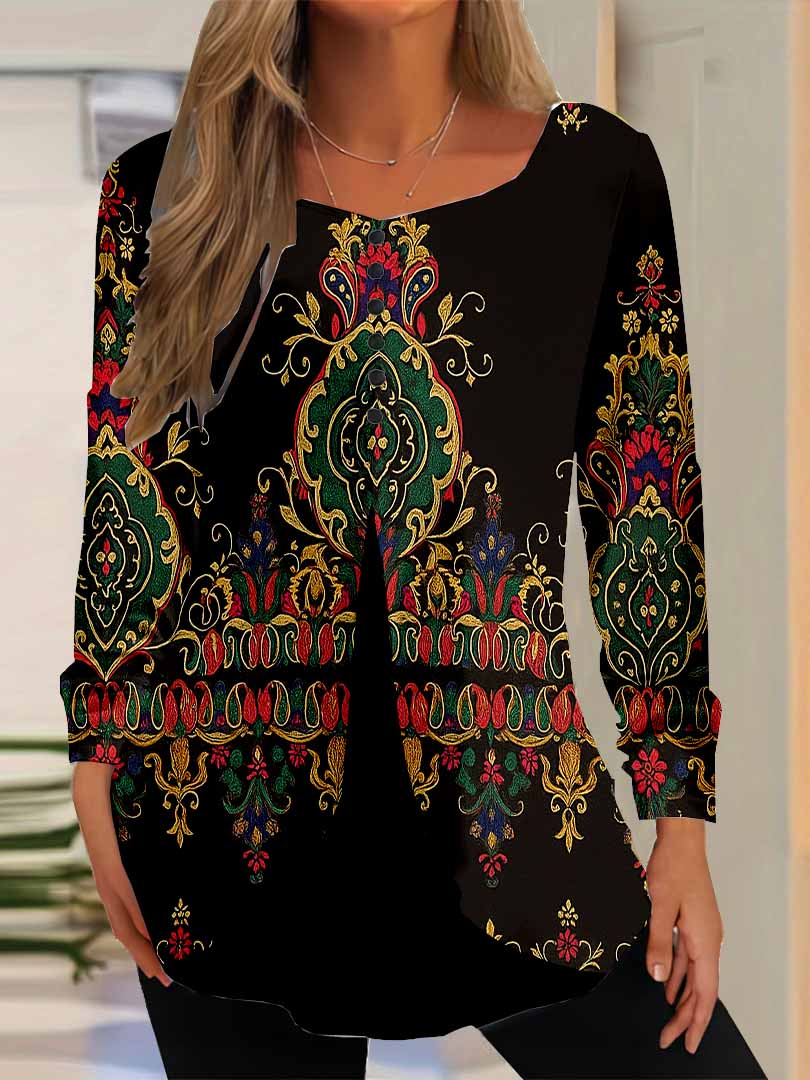 Women Graphic,Black DZGG8175 Long Sleeve Scoop Neck Printed Graphic Button Fake 2in1 Tops