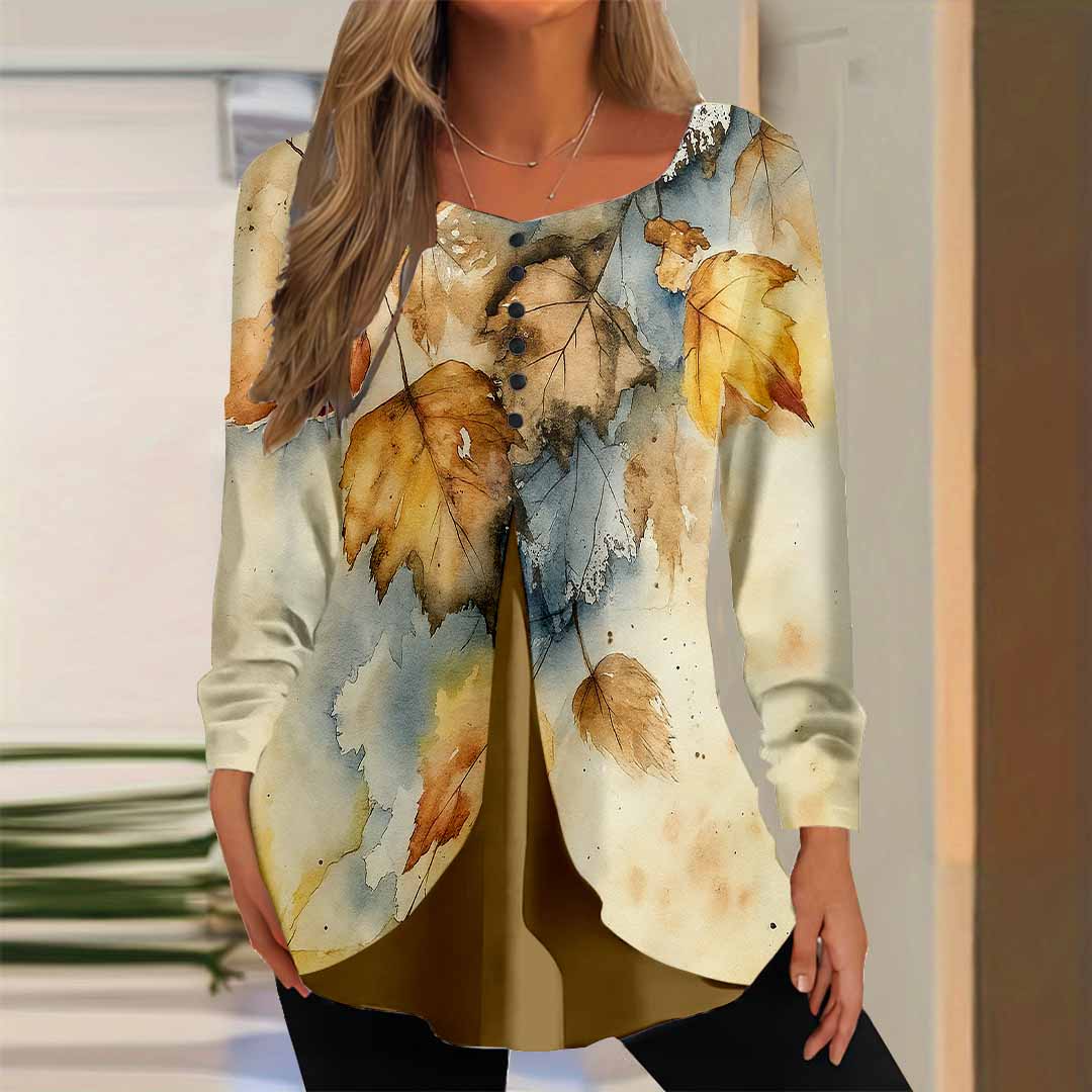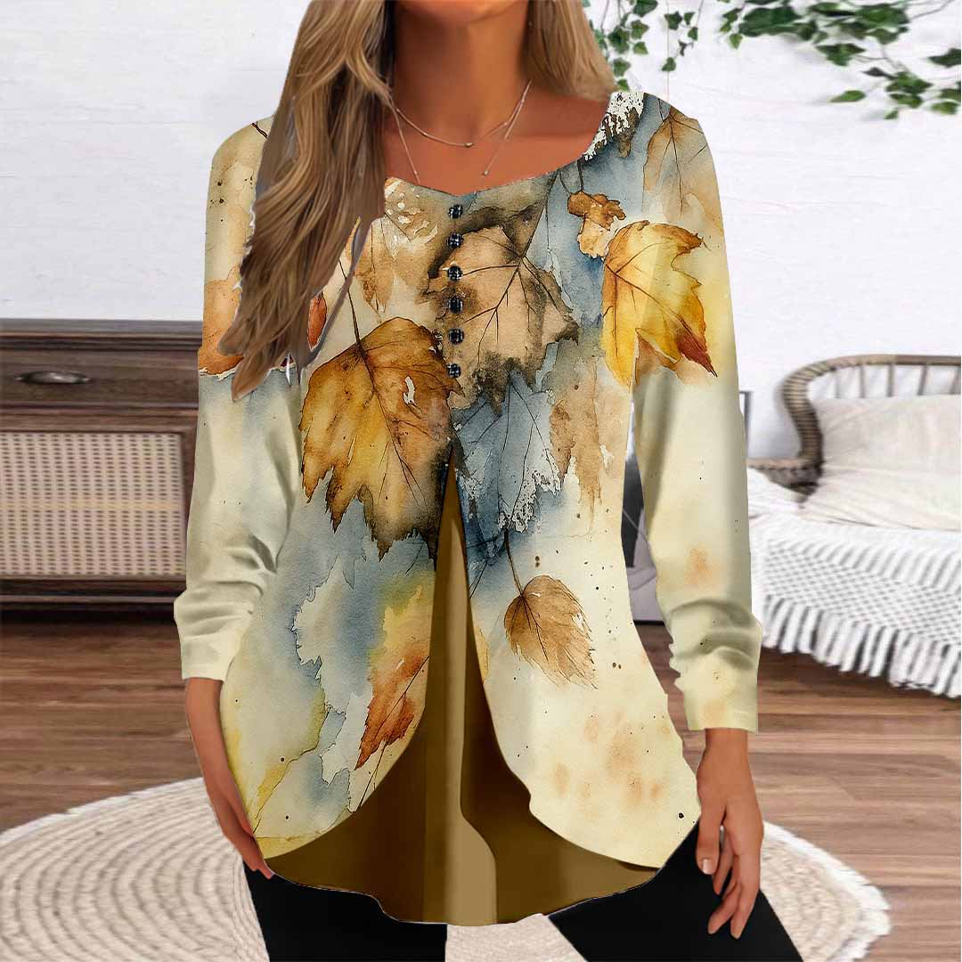 Women Graphic,Yellow DZGG8203 Long Sleeve Scoop Neck Printed Graphic Button Fake 2in1 Tops