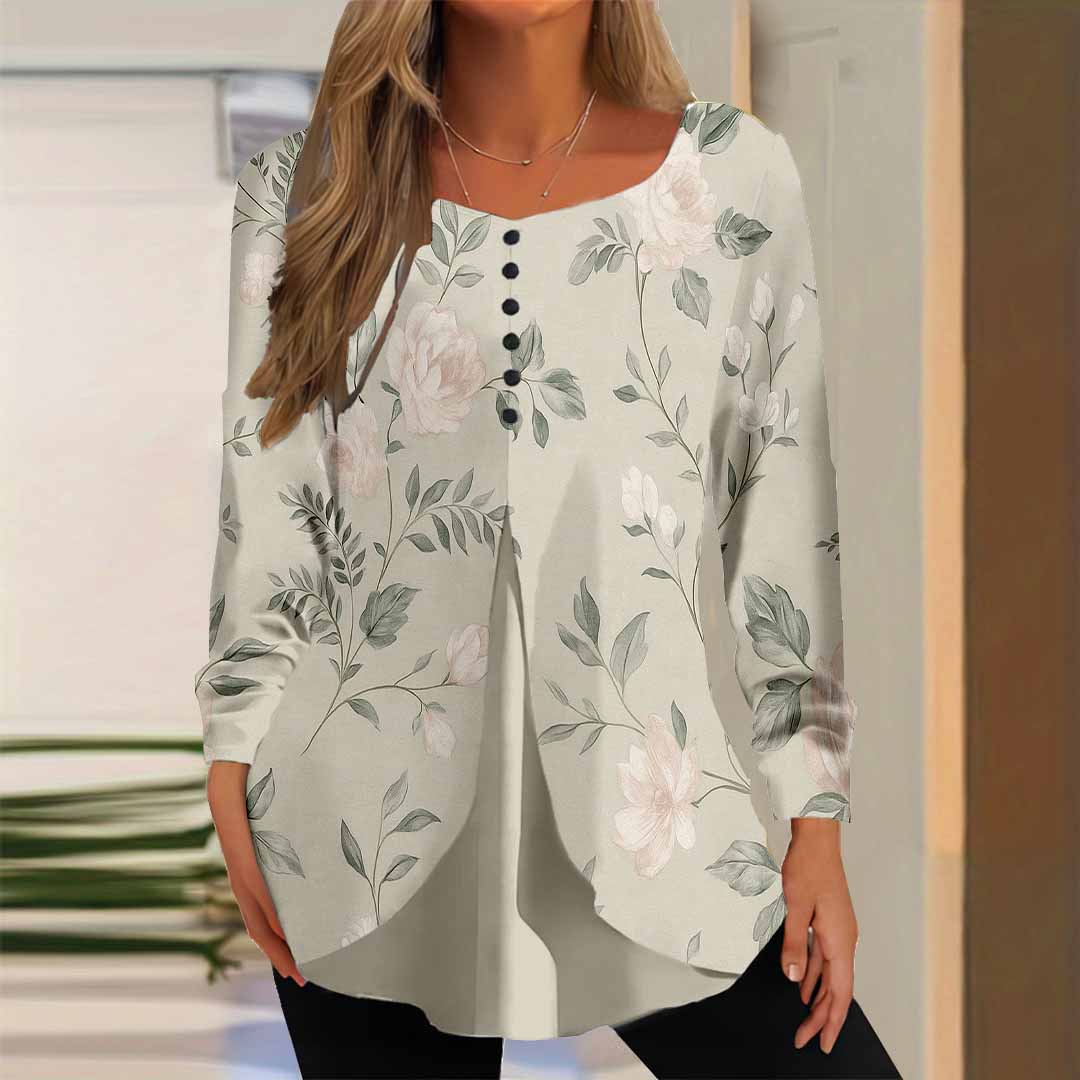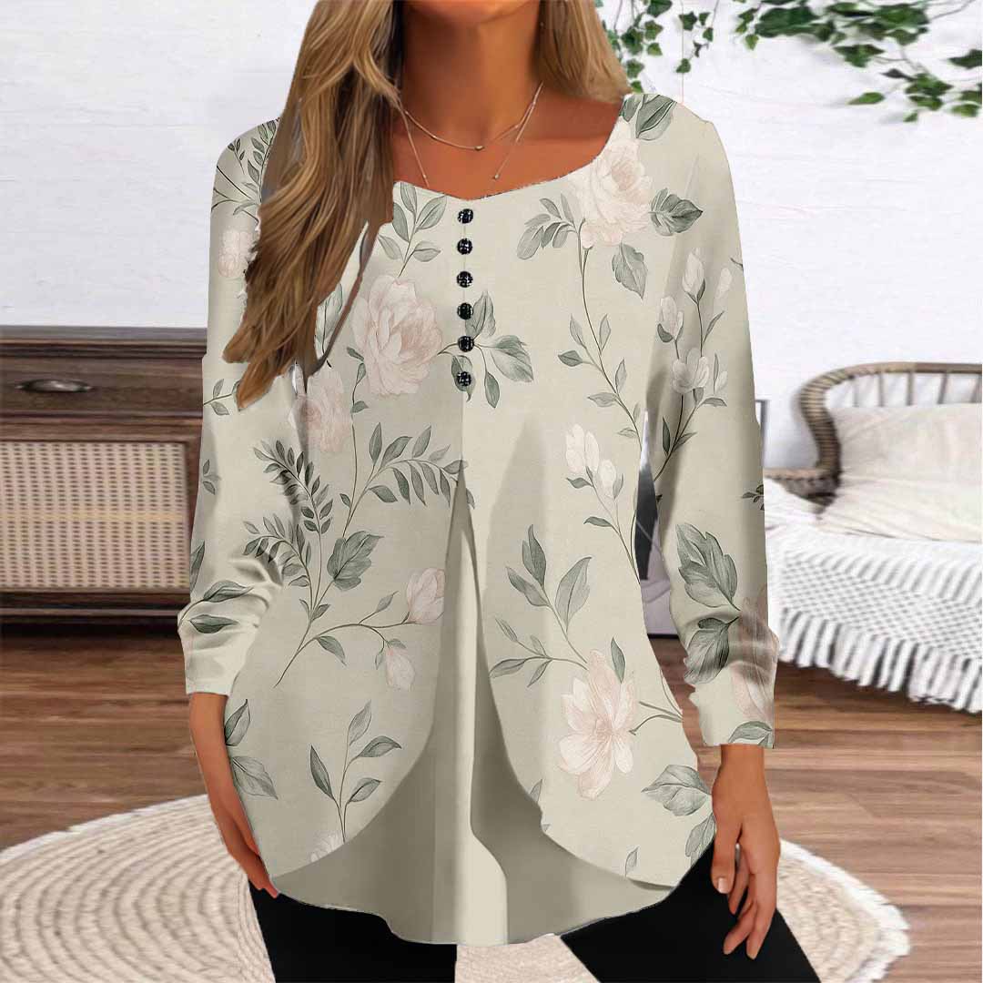 Women Floral,Green DZGG8211 Long Sleeve Scoop Neck Printed Graphic Button Fake 2in1 Tops