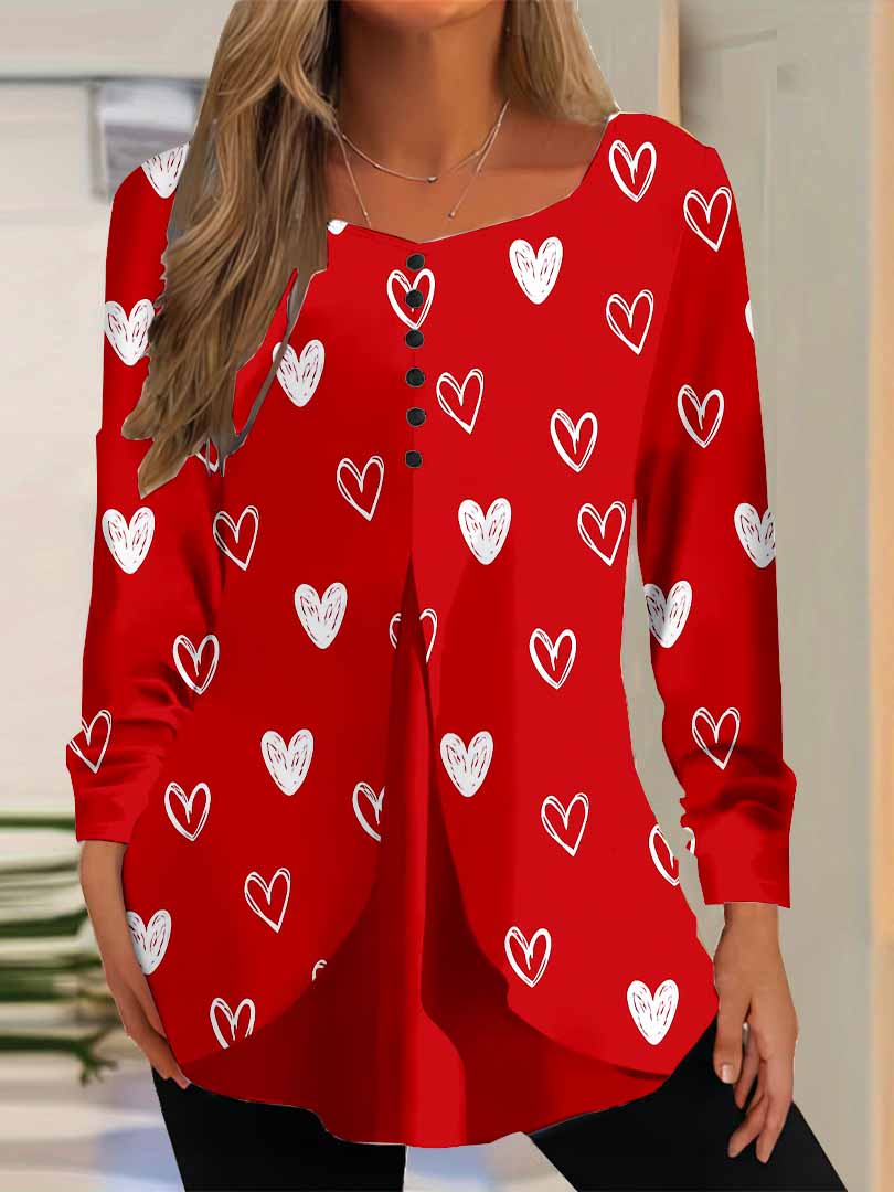 Women Graphic,Red DZGG8259 Long Sleeve Scoop Neck Printed Graphic Button Fake 2in1 Tops