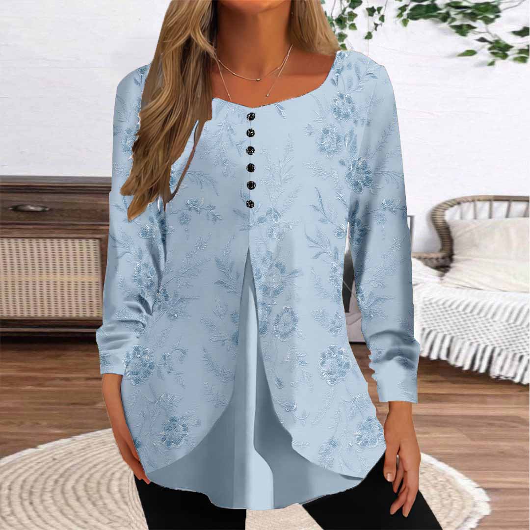 Women Floral,Blue DZGG8260 Long Sleeve Scoop Neck Printed Graphic Button Fake 2in1 Tops