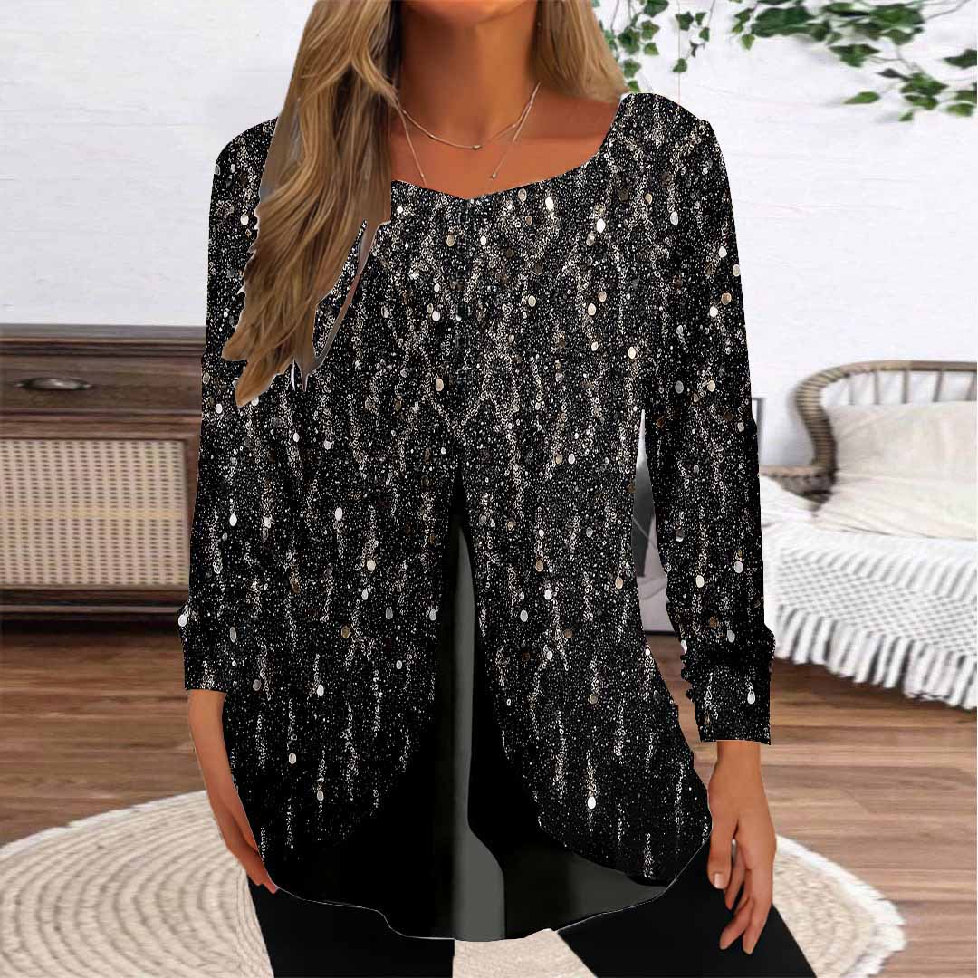 Women Graphic,Black DZGG8262 Long Sleeve Scoop Neck Printed Graphic Button Fake 2in1 Tops