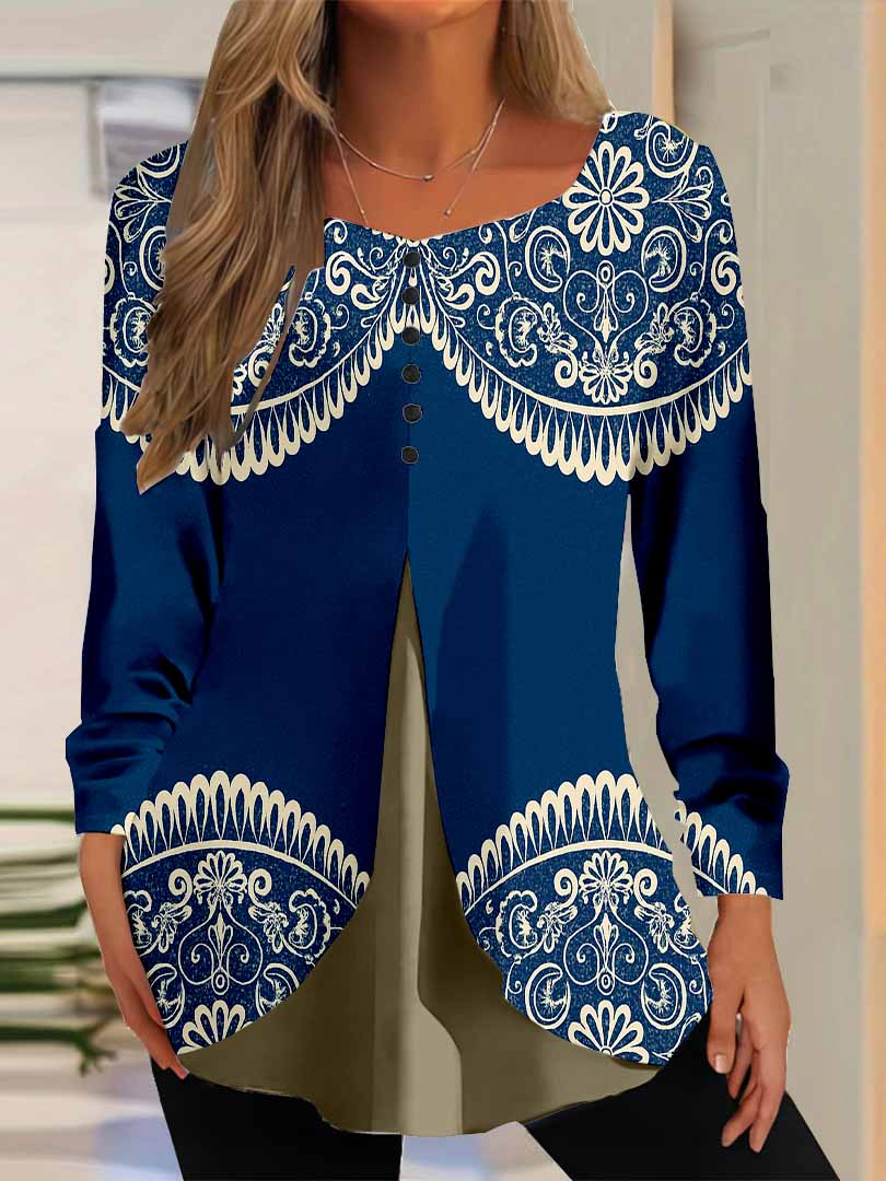 Women Graphic,Blue DZGG8292 Long Sleeve Scoop Neck Printed Graphic Button Fake 2in1 Tops