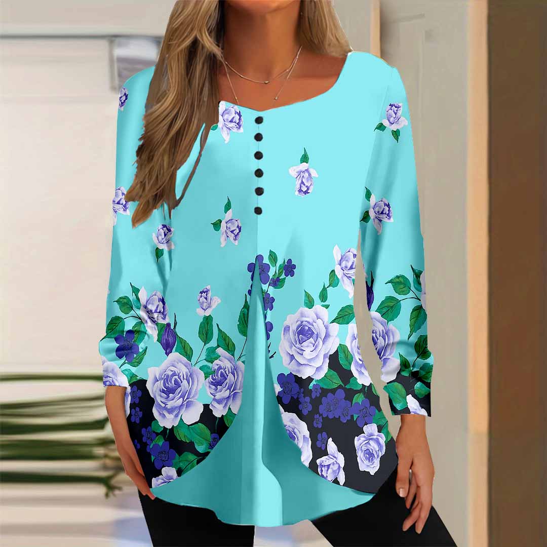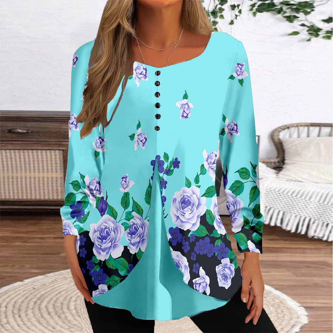 Women Floral,Blue DZGG8303 Long Sleeve Scoop Neck Printed Graphic Button Fake 2in1 Tops