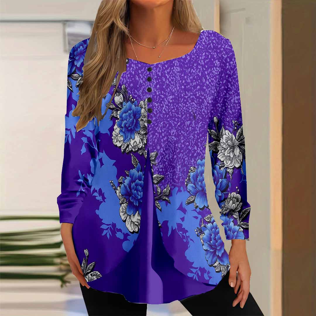 Women Floral,Purple DZGG8305 Long Sleeve Scoop Neck Printed Graphic Button Fake 2in1 Tops