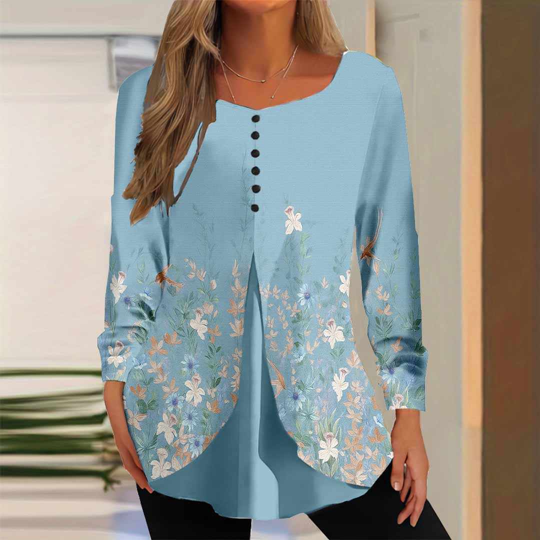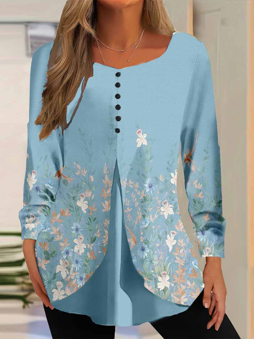 Women Floral,Blue DZGG8322 Long Sleeve Scoop Neck Printed Graphic Button Fake 2in1 Tops
