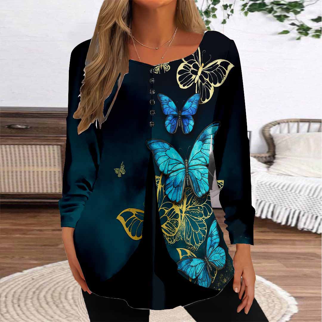 Women Graphic,Blue DZGG8341 Long Sleeve Scoop Neck Printed Graphic Button Fake 2in1 Tops