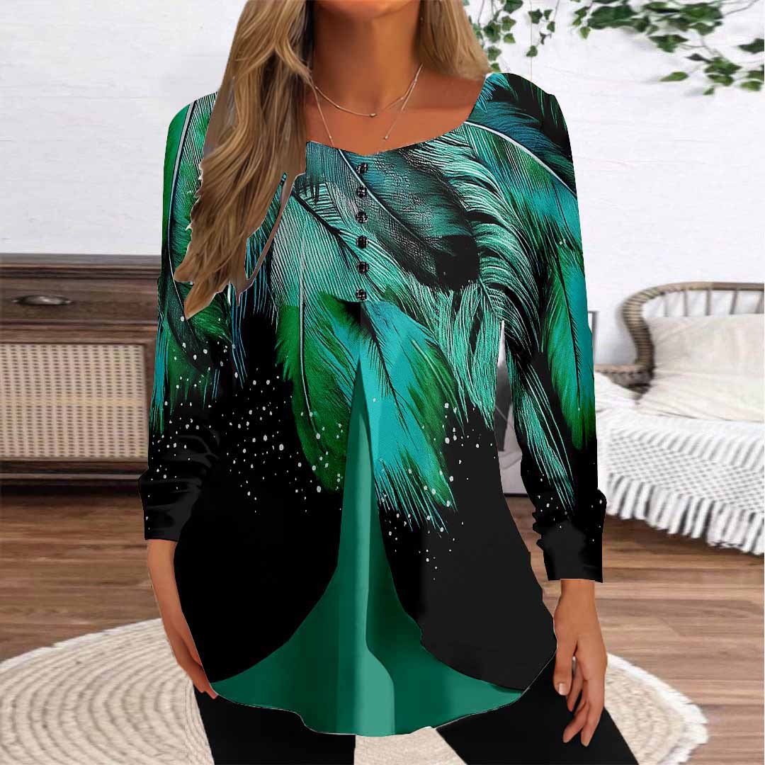 Women Floral,Green DZGG8352 Long Sleeve Scoop Neck Printed Graphic Button Fake 2in1 Tops
