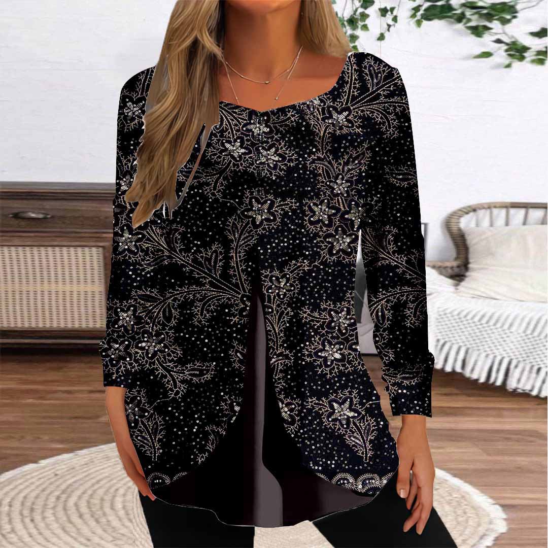 Women Graphic,Black DZGG8360 Long Sleeve Scoop Neck Printed Graphic Button Fake 2in1 Tops