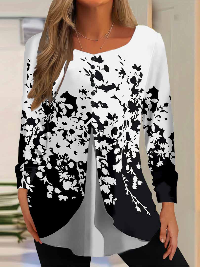 Women Floral,Black DZGG8365 Long Sleeve Scoop Neck Printed Graphic Button Fake 2in1 Tops