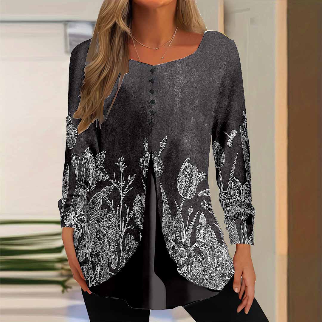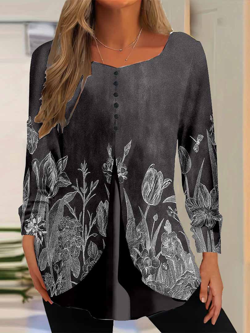 Women Floral,Black DZGG8371 Long Sleeve Scoop Neck Printed Graphic Button Fake 2in1 Tops