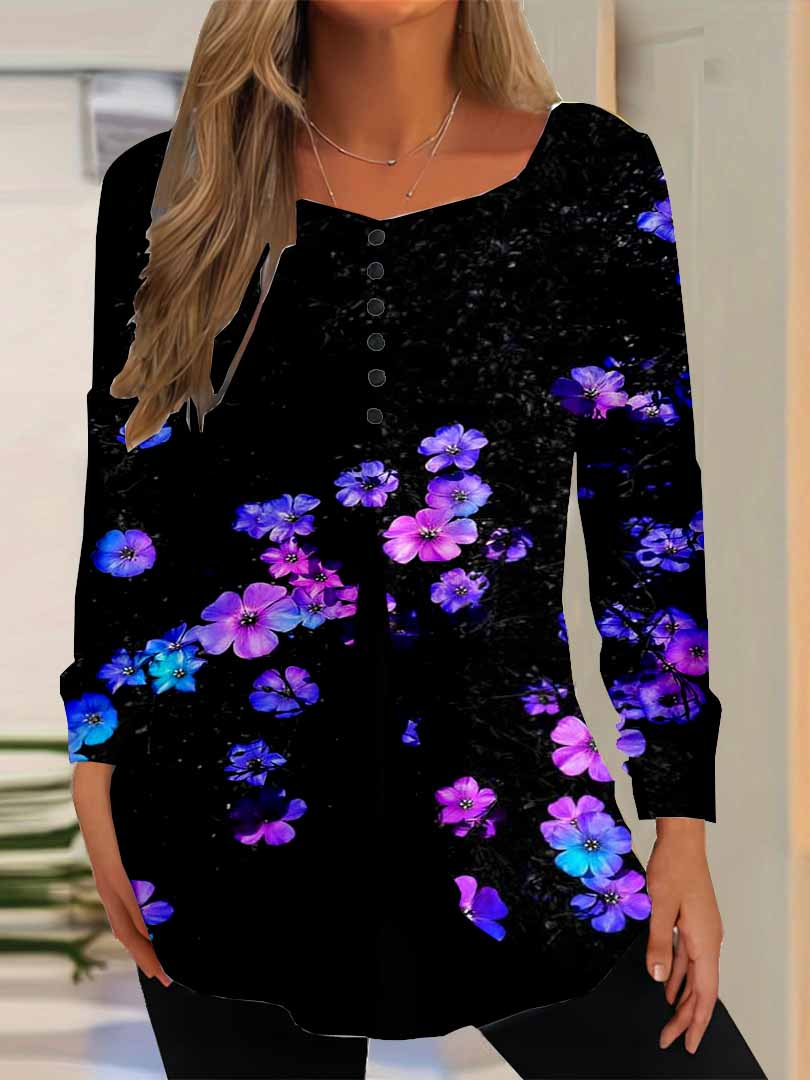 Women Floral,Black DZGG8372 Long Sleeve Scoop Neck Printed Graphic Button Fake 2in1 Tops
