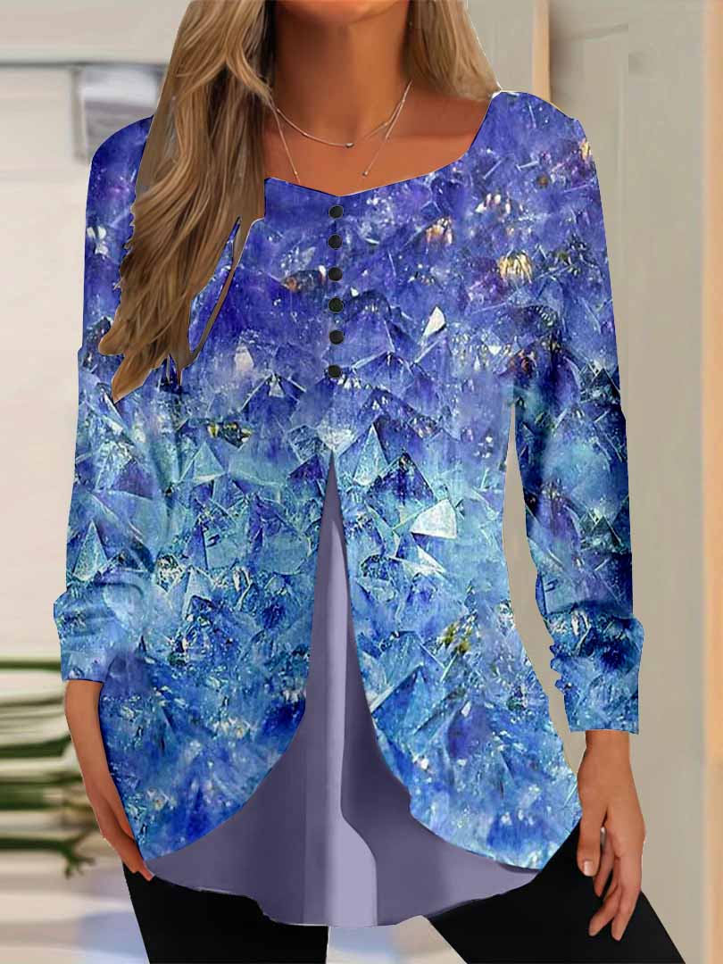 Women Graphic,Blue DZGG8378 Long Sleeve Scoop Neck Printed Graphic Button Fake 2in1 Tops