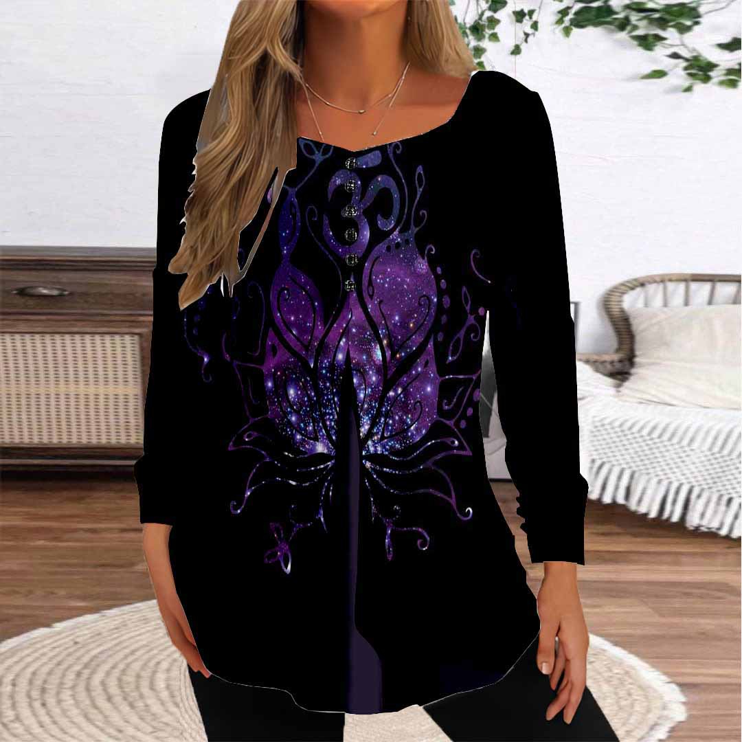 Women Graphic,Black DZGG8384 Long Sleeve Scoop Neck Printed Graphic Button Fake 2in1 Tops