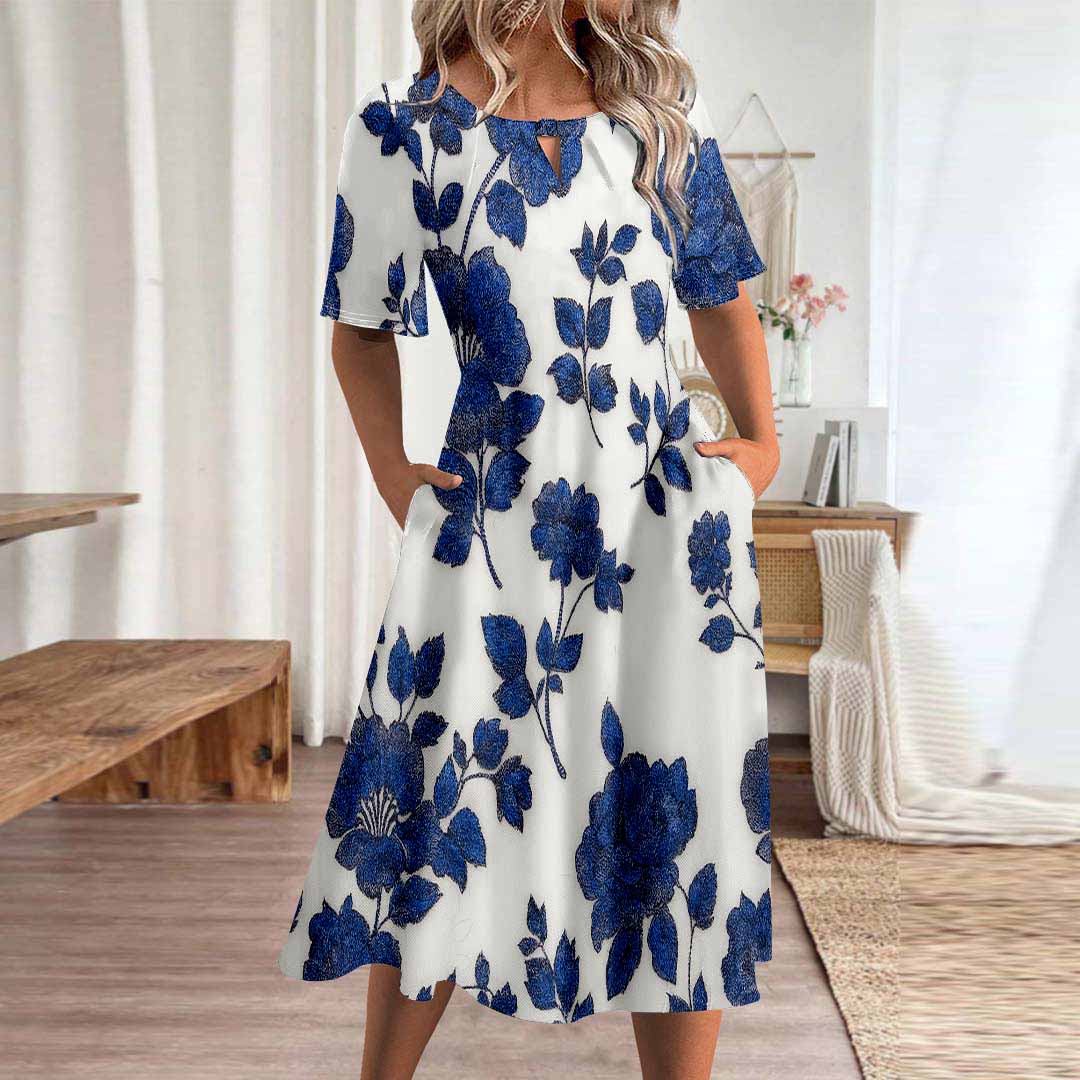 Women Floral,Blue DZHA8053 Short Sleeve Scoop Neck Graphic Printed Hollow Midi Dress
