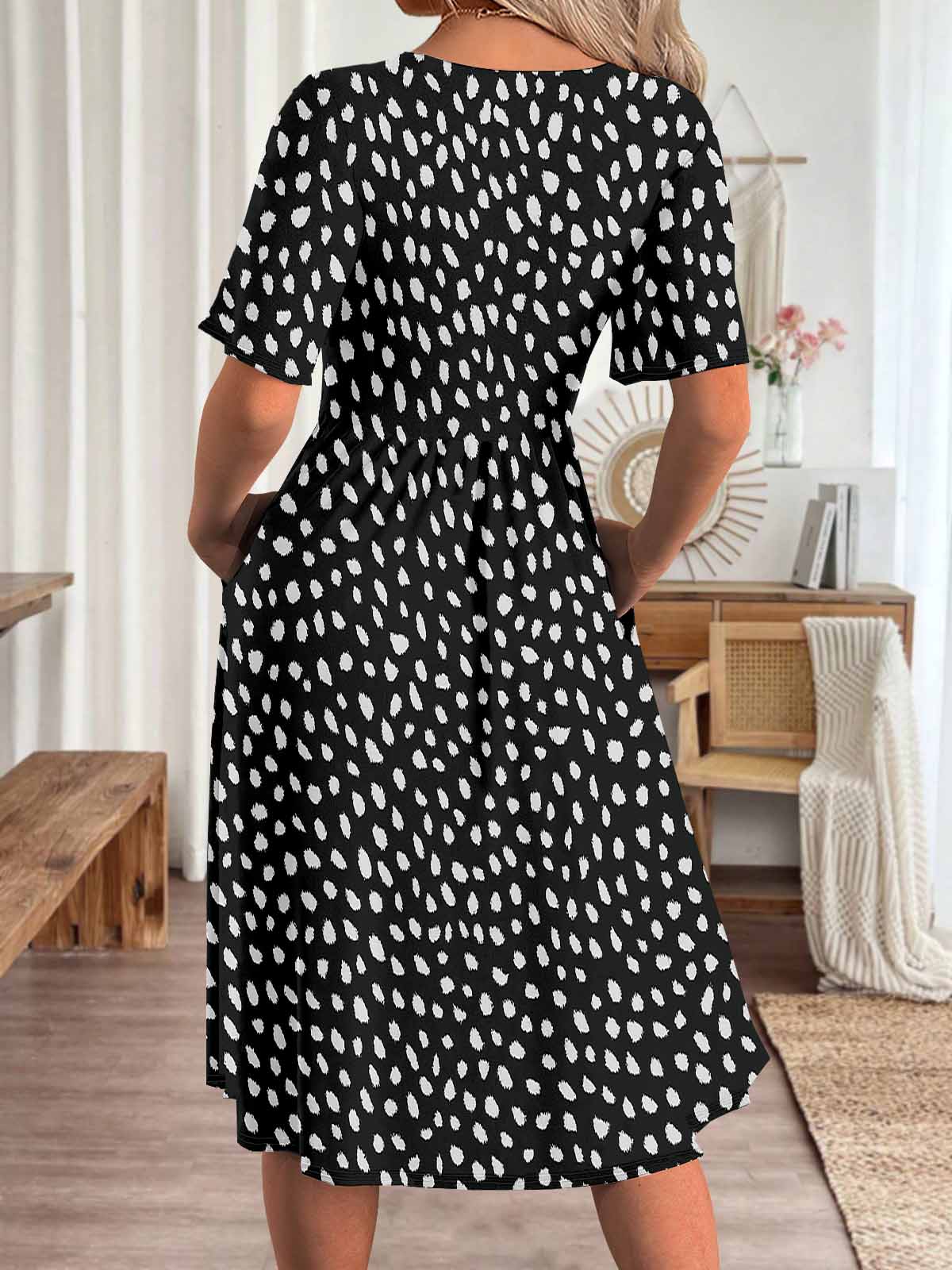 Women Polka Dot,Black DZHA8151 Short Sleeve Scoop Neck Graphic Printed Hollow Midi Dress