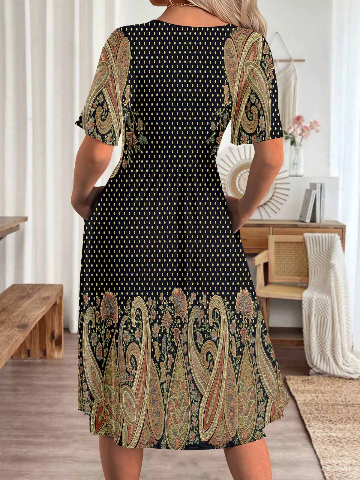 Women Graphic,Brown DZHA8167 Short Sleeve Scoop Neck Graphic Printed Hollow Midi Dress
