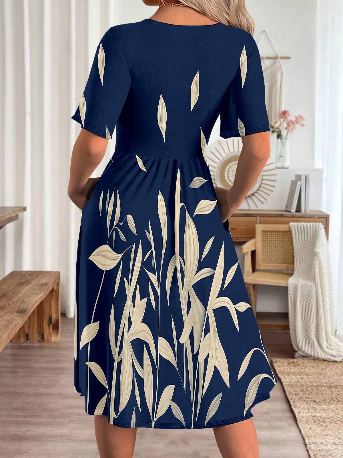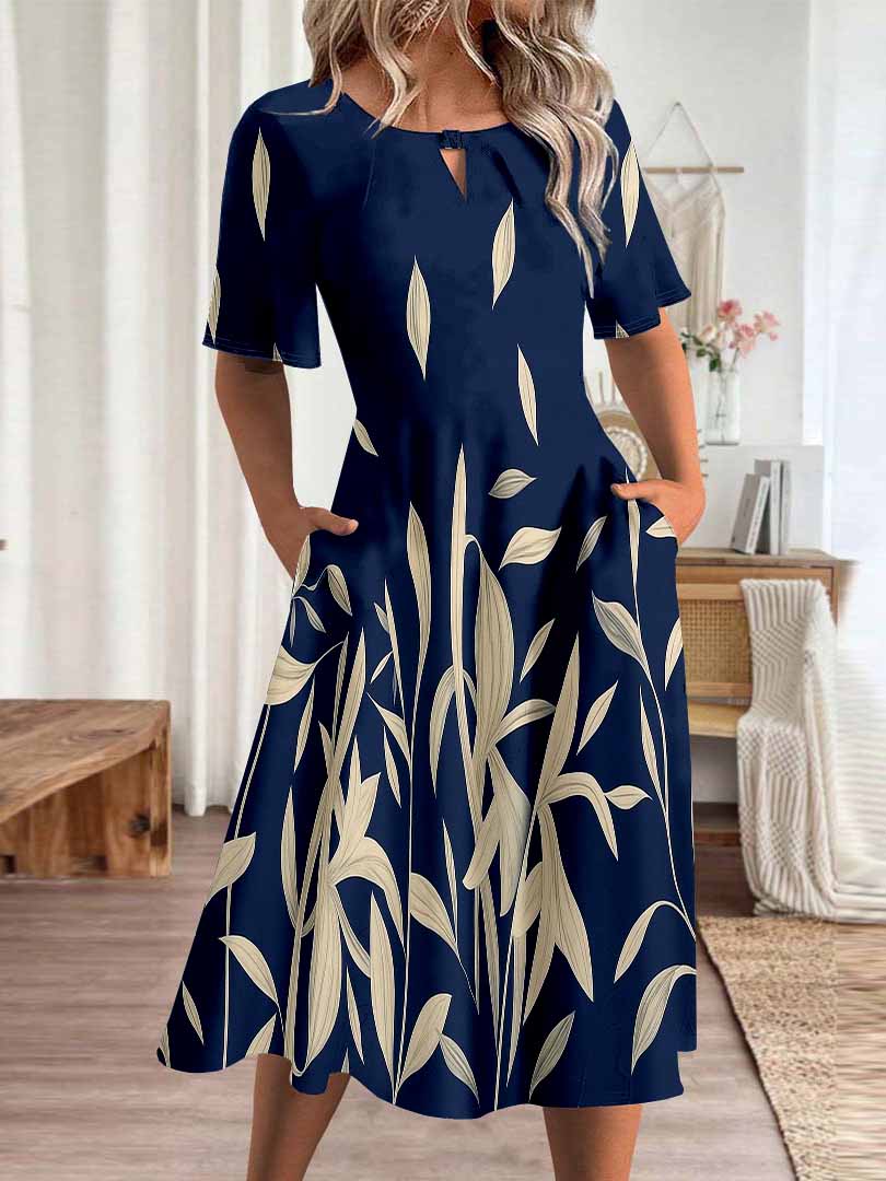 Women Floral,Blue DZHA8179 Short Sleeve Scoop Neck Graphic Printed Hollow Midi Dress
