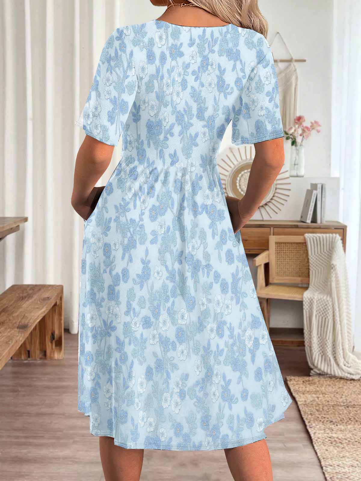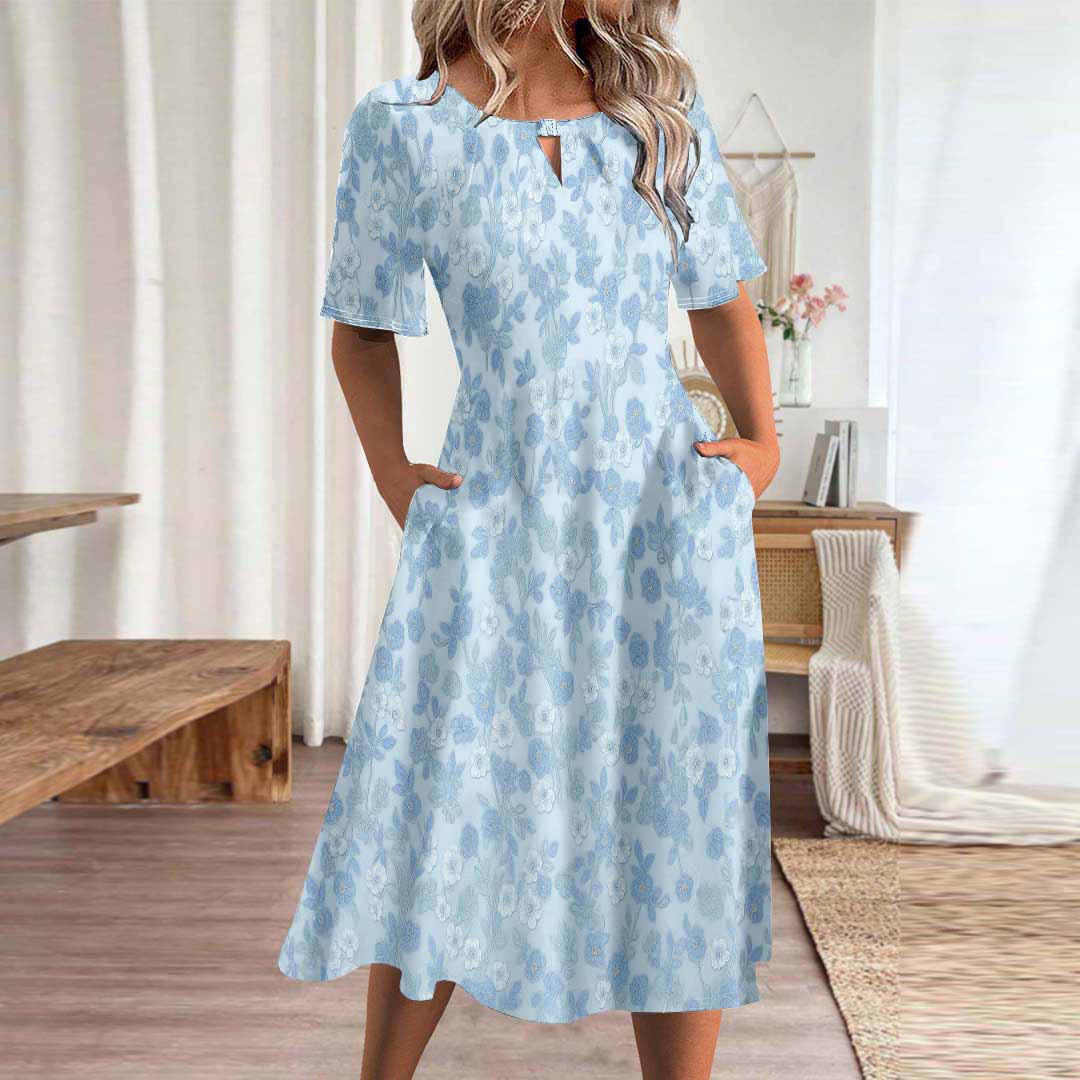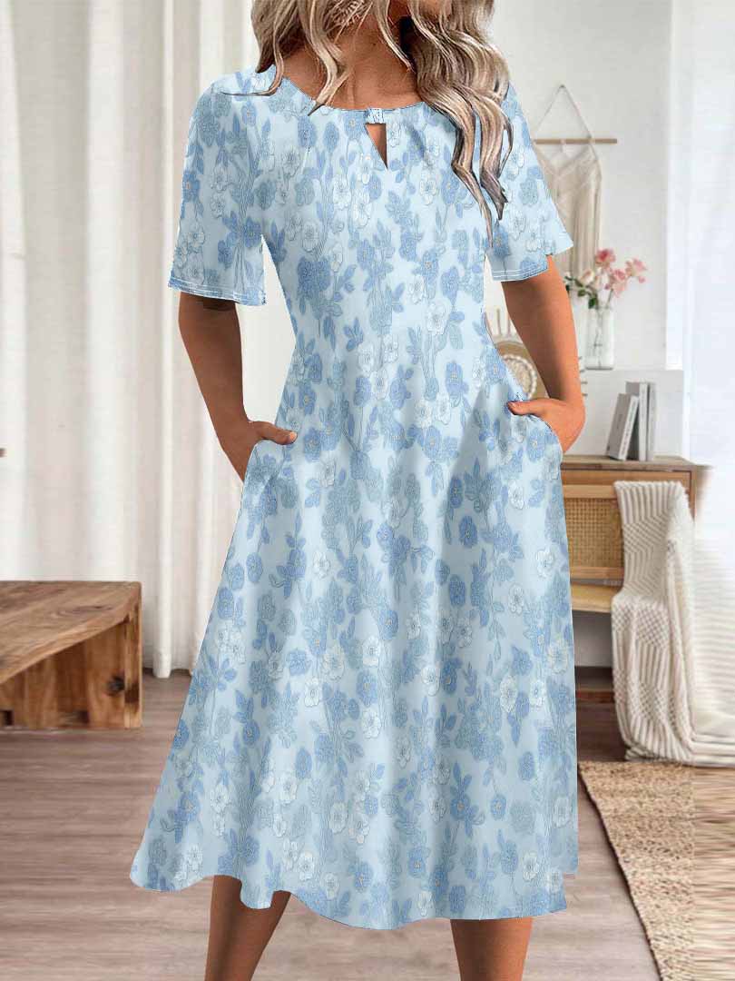 Women Floral,Blue DZHA8214 Short Sleeve Scoop Neck Graphic Printed Hollow Midi Dress
