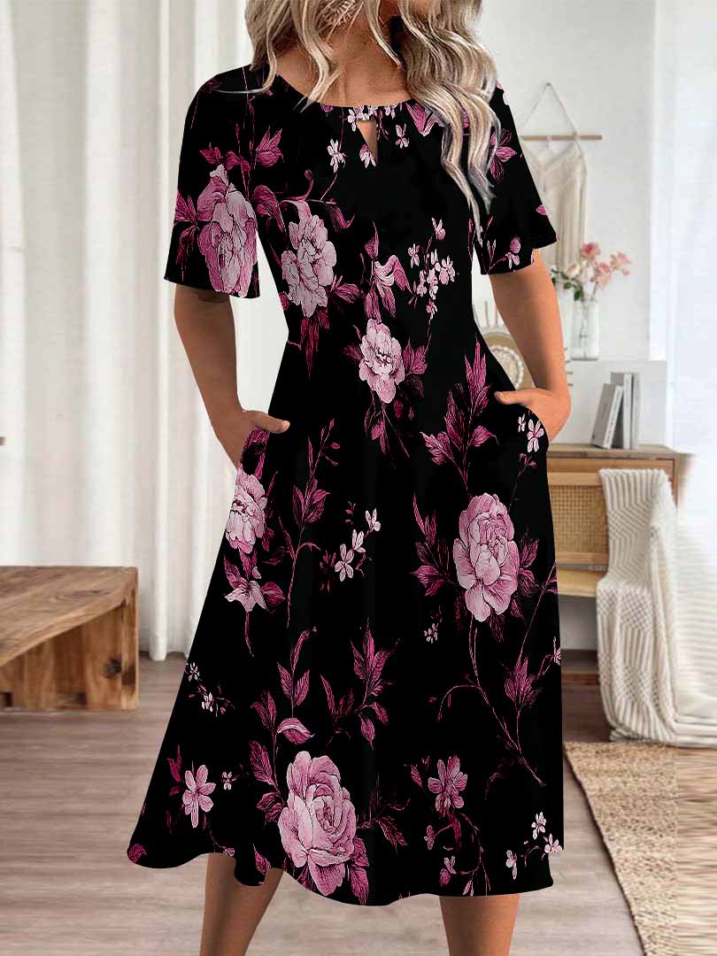 Women Floral,Pink DZHA8230 Short Sleeve Scoop Neck Graphic Printed Hollow Midi Dress