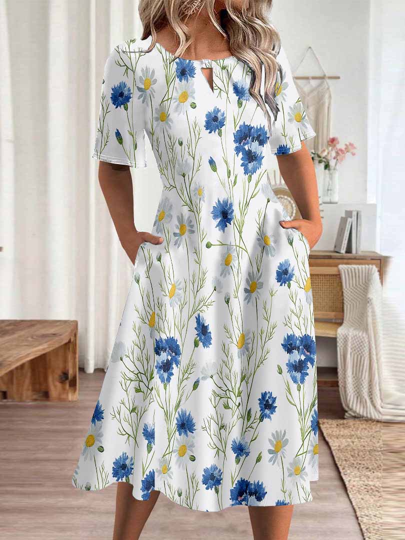 Women Floral,Blue DZHA8236 Short Sleeve Scoop Neck Graphic Printed Hollow Midi Dress
