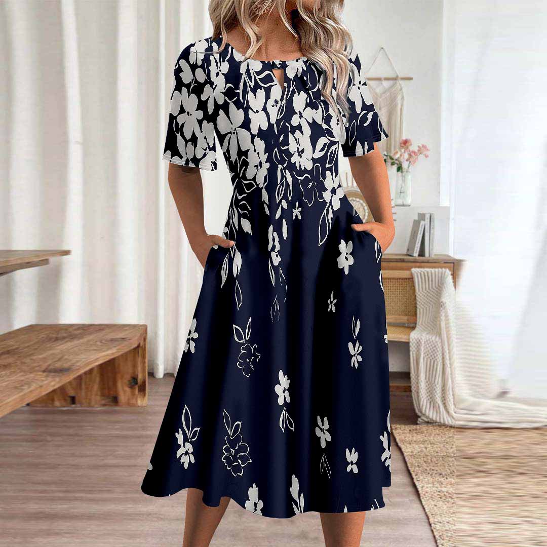 Women Floral,Blue DZHA8274 Short Sleeve Scoop Neck Graphic Printed Hollow Midi Dress