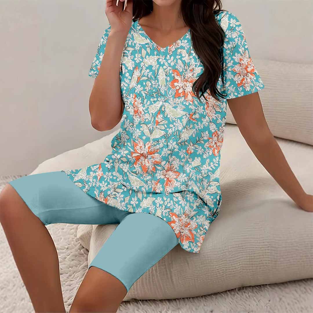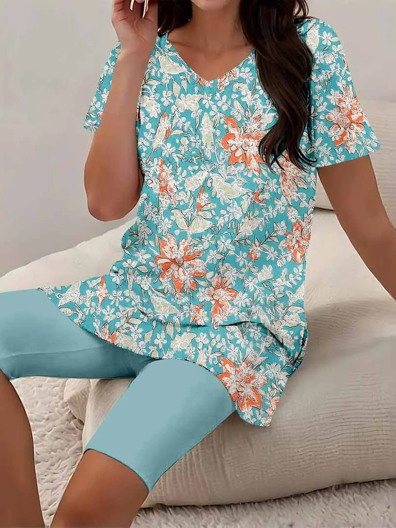 Women Floral,Green,Red DZCJ0845 Short Sleeve Tops and Shorts Plus Size
